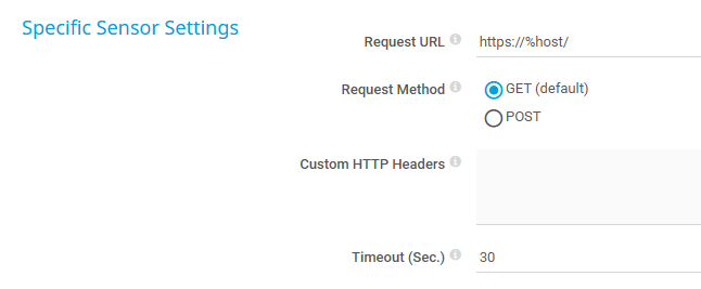 Enter the URL that you want to request. This setting supports smart URL replacement. If you enter http:///, PRTG automatically fills in the IP address or DNS name of the parent device. The default URL is https://%host/.
